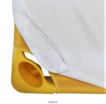 Az alsó oldal puha, fehér pamutfrottírral bevont, vízhatlan és légáteresztő technikai réteget tartalmaz, amely megvédi a fektetőket a nedvességtől és szennyeződésektől, miközben biztosítja a megfelelő szellőzést.